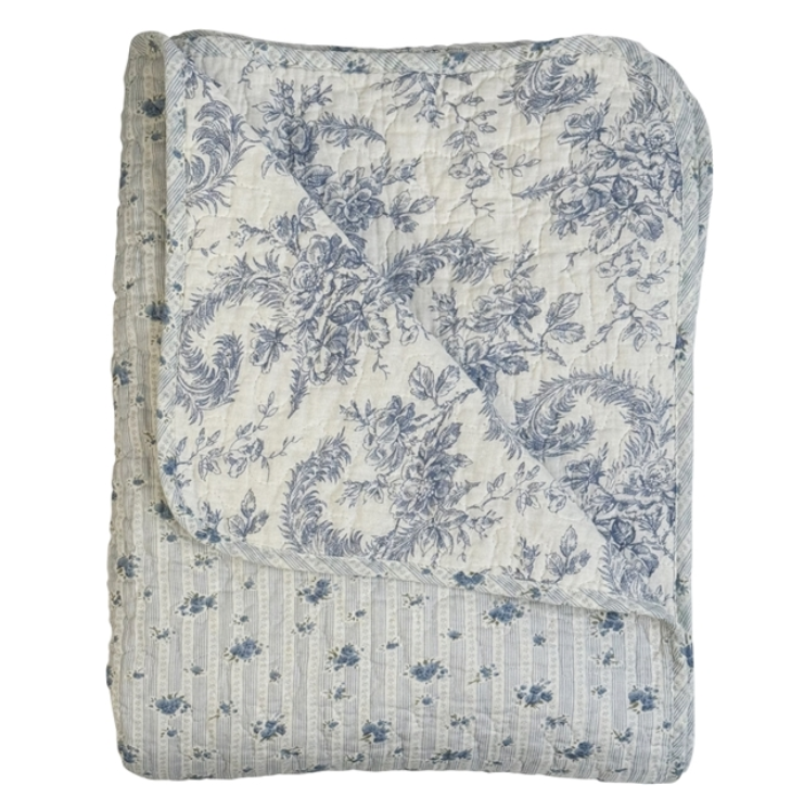 Nydelig quilt med forskjellig mønster på hver side. Blåblomstret.