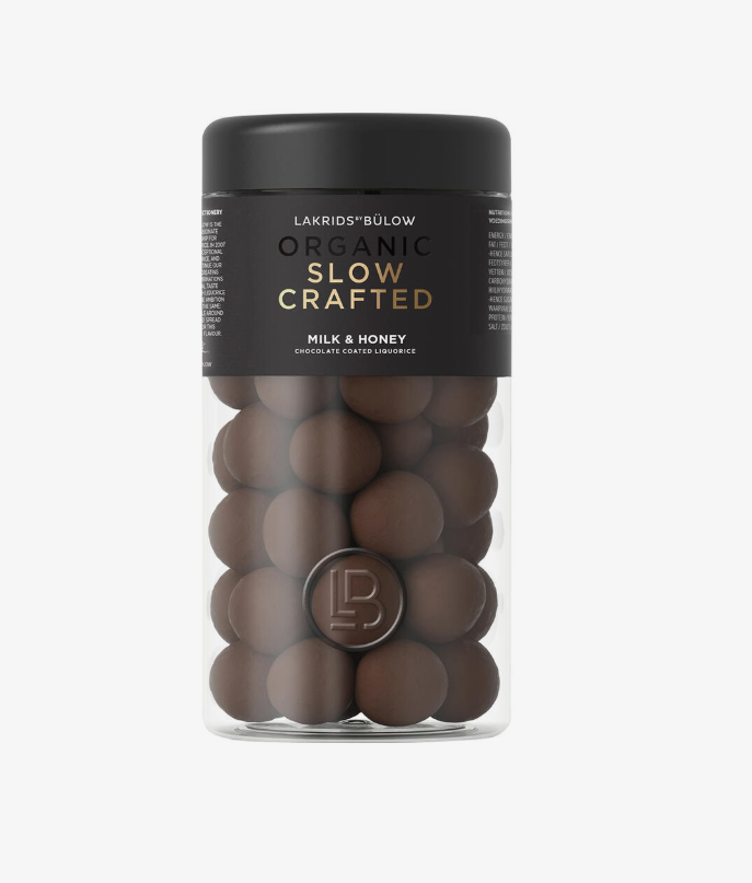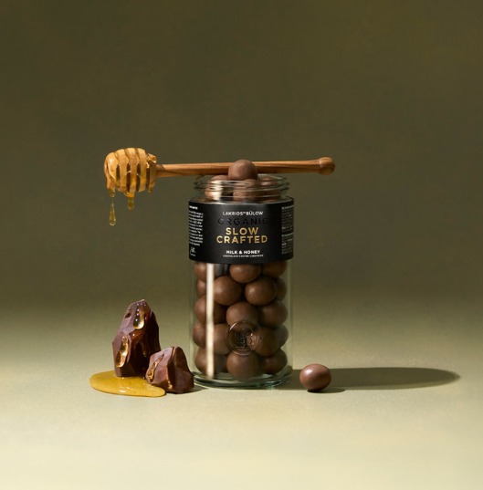 Skjem bort deg selv med MILK & HONEY, som gir deg naturens gull i en unik SLOW CRAFTED lakriskjerne. Vi har alltid vært fascinert av bier og den søte magien de produserer, og derfor har vi eksperimentert med en spesiell SLOW CRAFTED-oppskrift som bruker økologisk honning fra en lokal dansk produsent. En myk, karamellaktig smaksopplevelse, kombinert med myk melkesjokolade og flak av havsalt, som får deg til å føle deg i pakt med naturen og de summende biene.