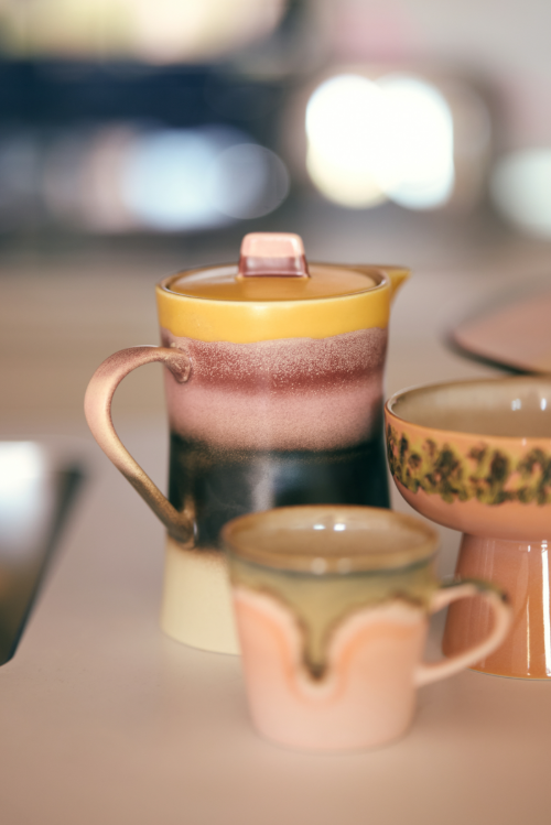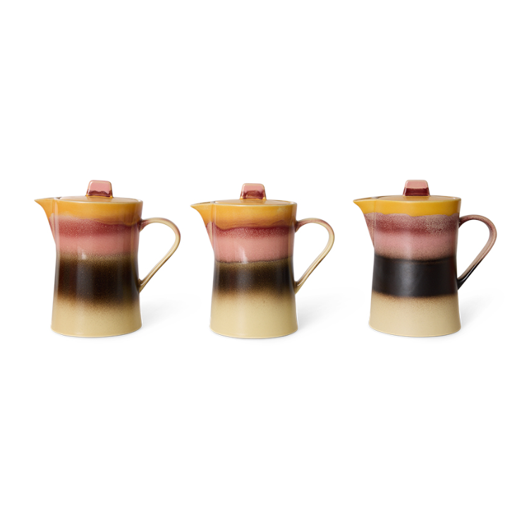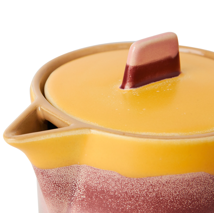 Denne tekannen er en del av HK Livings populære 70s Ceramics-kolleksjon, som henter inspirasjon fra 1970-tallets farger og former. «Sunset»-varianten har varme, jordnære toner som minner om solnedgang, og gir et retro, men samtidig moderne uttrykk.