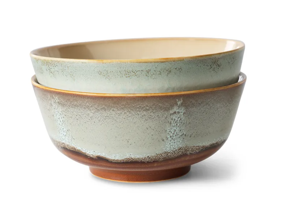 Ta middagsopplevelsen til et nytt nivå med 70s Ceramics ramenboller i fargen Verge – et sett med to håndglaserte skåler inspirert av japansk matkultur og den karakteristiske estetikken fra 70-tallet.