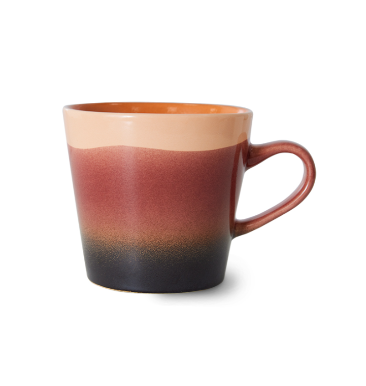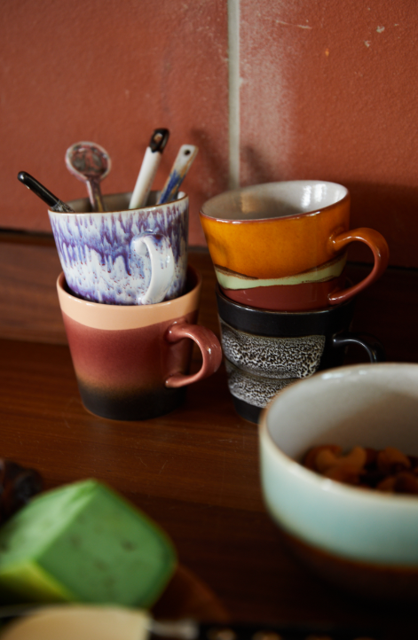 «Rise»-varianten er en del av HK Livings retroinspirerte 70s Ceramics-kolleksjon. Den har en reaktiv glasur i varme, jordnære toner som gir et rolig og harmonisk uttrykk. Hver kopp er håndlaget og har sitt eget unike mønster.