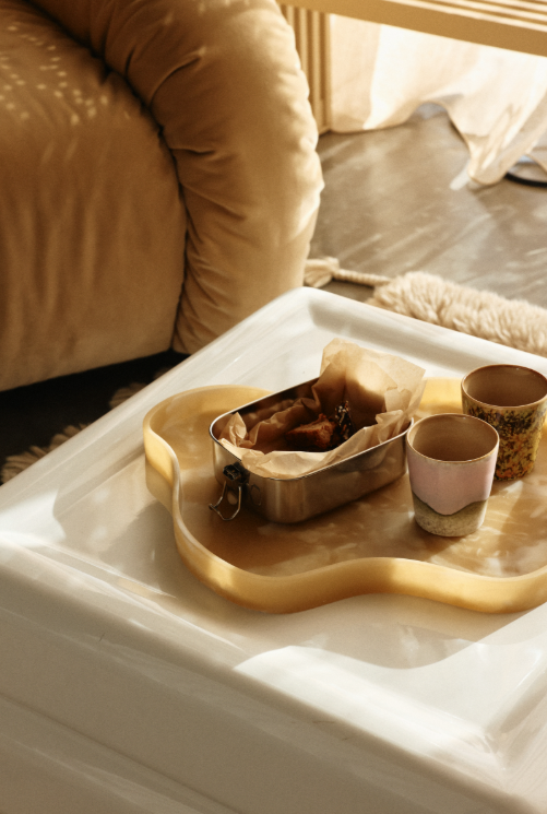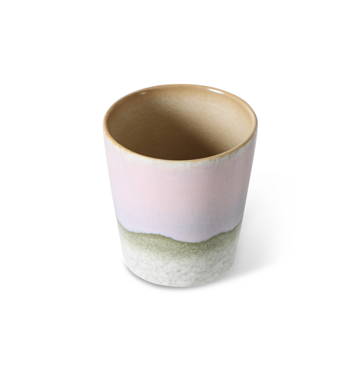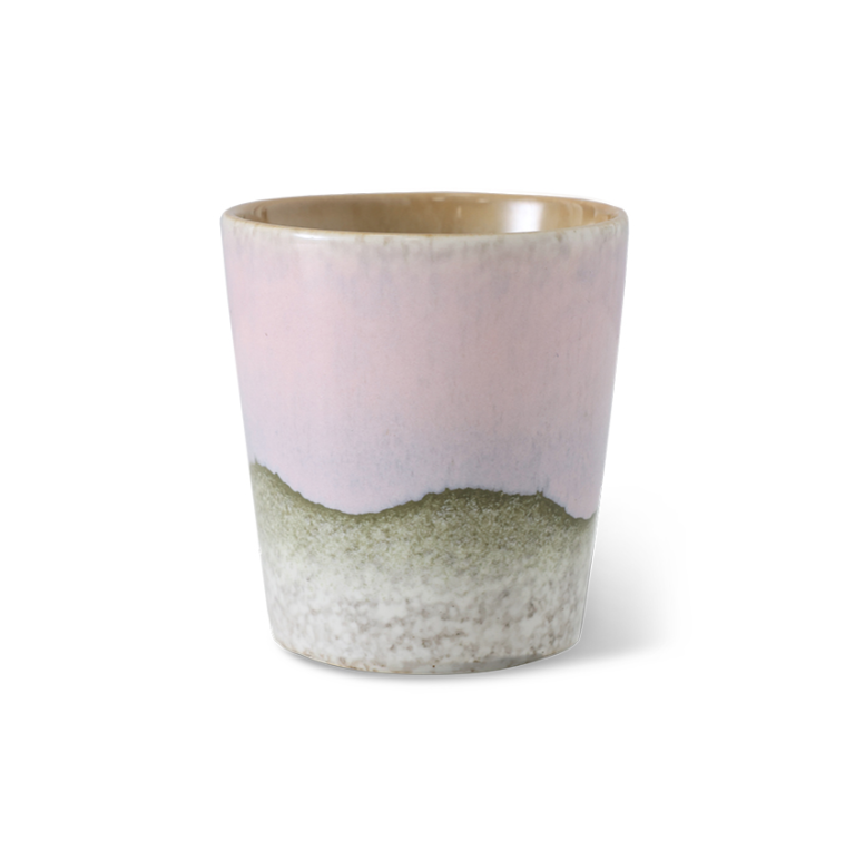 «Bramble»-varianten av kaffekoppen fra HK Livings 70s Ceramics-kolleksjon kombinerer retrodesign med moderne minimalisme. Den har en rolig og naturlig fargepalett med blågrønne toner og en lett, luftig finish som gir en avslappet og harmonisk følelse.