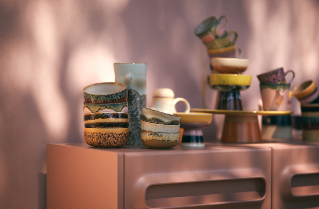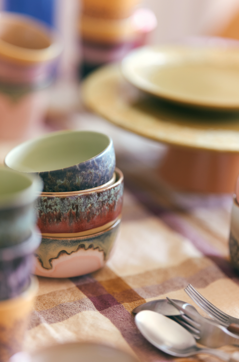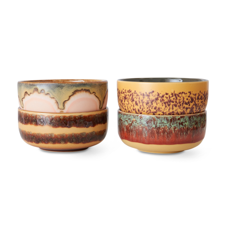 Dette settet med dessertskåler fra HK Livings 70s Ceramics-kolleksjon er inspirert av 1970-tallets estetikk, med en finish som minner om rå kystlinjer og naturlige teksturer
