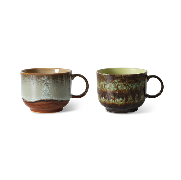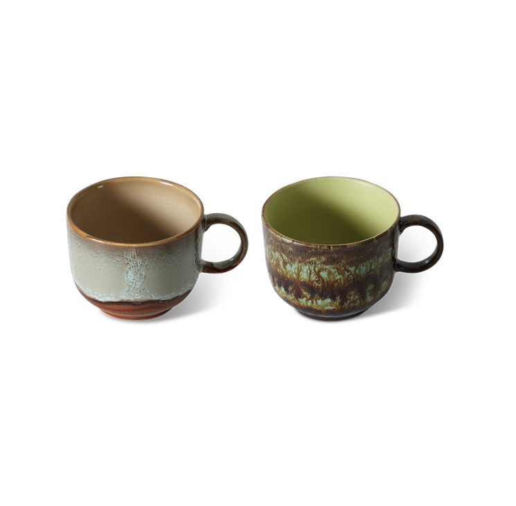 Disse koppene er ideelle for te, kaffe eller varm sjokolade, og gir et håndlaget og personlig preg til borddekkingen. De leveres som et sett med to og passer perfekt sammen med andre produkter i 70s Ceramics-serien.