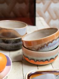 Denne keramikkkolleksjonen fra 70-tallet henter inspirasjon fra flere tiår med kunst – tenk popkunst, surrealisme, ekspresjonisme og abstrakte former. Hvert stykke kombinerer dristige overflater og teksturerte glasurer for et utseende som føles både kuratert og kreativt.