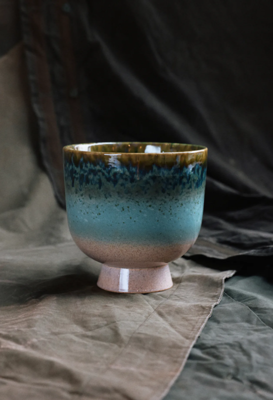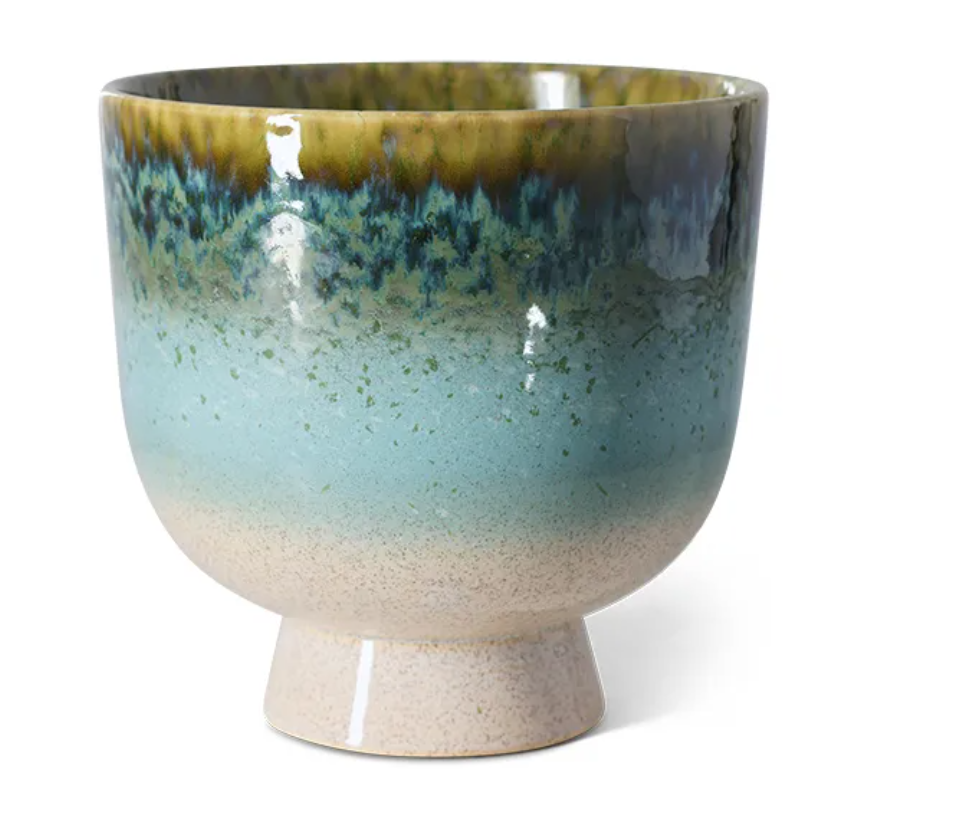 Laget av glasert keramikk med en reaktiv glasur, får hver potte sitt helt unike preg. De myke blåtonene gir assosiasjoner til vinterlige landskap og passer perfekt inn i skandinavisk interiør eller moderne, minimalistiske rom. Med en diameter på litt over 20 cm er den ideell for små til mellomstore planter – enten på vinduskarmen, en hylle eller som en del av en grønn oase på gulvet. Potten kombinerer funksjonalitet og stil, og gjør det enkelt å fremheve plantenes naturlige skjønnhet.