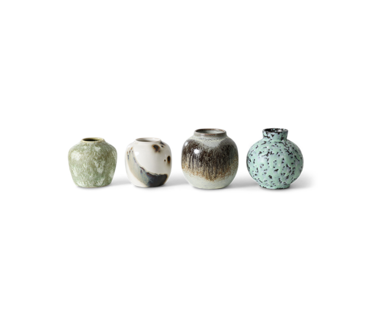Tilfør et snev av retrosjarm til hjemmet ditt med dette settet med fire keramiske vaser, en favoritt i vår ikoniske keramikkkolleksjon fra 70-tallet. Hver vase har en unik form og håndlaget glasur, noe som gjør hvert enkelt produkt virkelig unikt. Perfekt for å vise frem enkeltstående stilker eller bare som dekorative detaljer, tilbyr dette settet uendelige stylingsmuligheter samtidig som det gir farge og karakter til ethvert interiør.