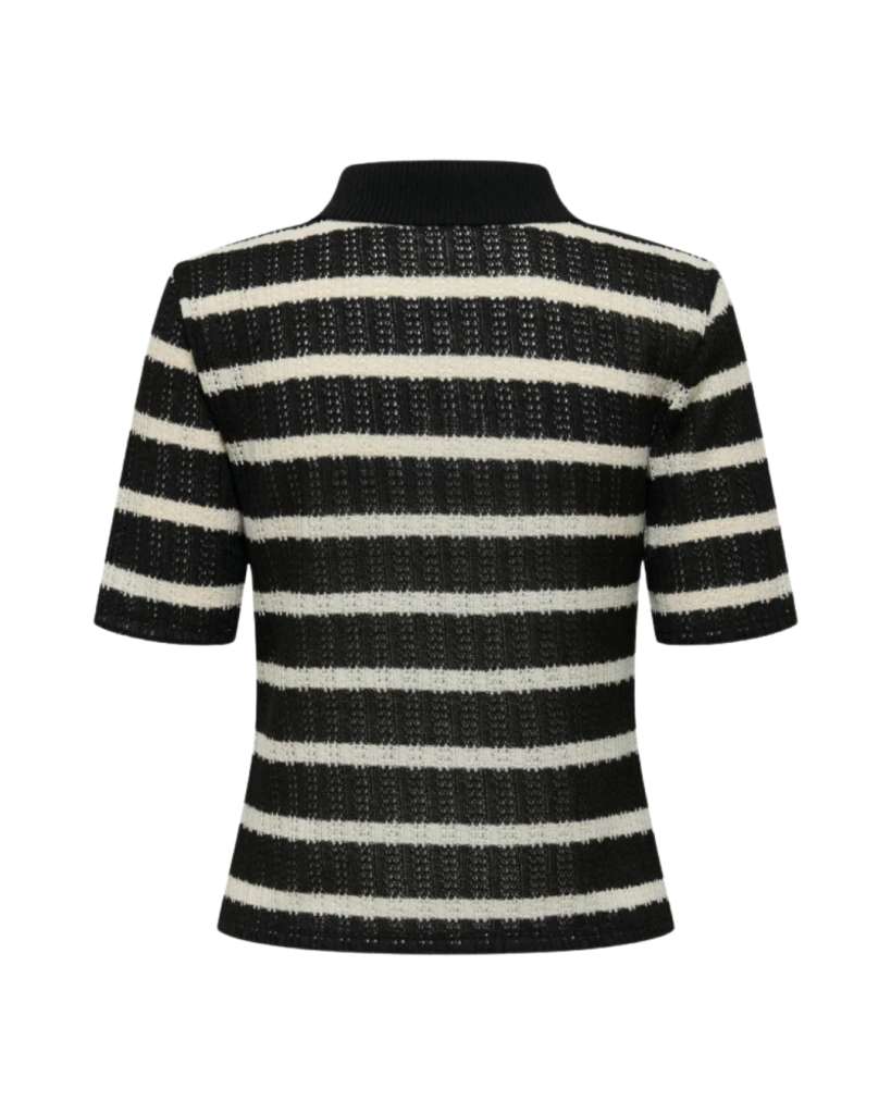 Her er noen detaljer om plagget:Design: Toppen har en klassisk polokrage og er laget i en strikket kvalitet med et stripet mønster i fargene svart og «cloud dancer» (en lys kremhvit nyanse). Den gir et avslappet, men sofistikert uttrykk