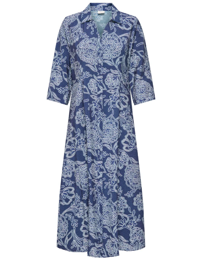 JDYELISE LIFE 3/4 MIDI DRESS WVN er en elegant kjole i mørkeblå denim med blomsterprint, perfekt for spesielle anledninger. Den kombinerer stil med bærekraft, takket være bruken av resirkulerte materialer.