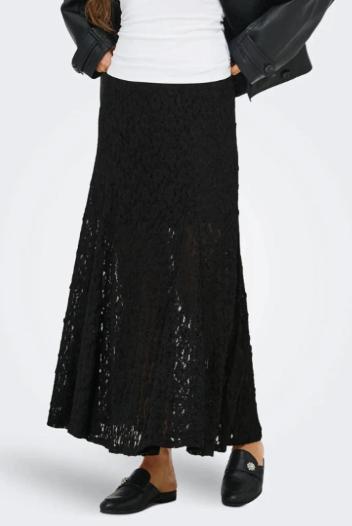Langt svart skjørt fra JDY med blondemønster over hele skjørtet. Det har en flytende silhuett og en elastisk midje.