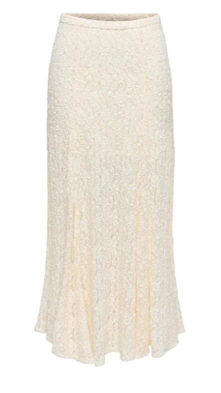 Langt skjørt fra JDY med blondemønster i en offwhite farge. Skjørtet har høyt liv og rekker ned til anklene.