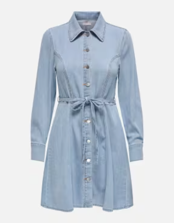 Hverdagskjole i tynn og myk denimkvalitet. Den har klassisk skjortekrage og knappestolpe hele veien ned i front. Lange ermer med en knapp på mansjetten. Avtagbart tynt knytebelte i midjen. Kule detaljer på sømmene nedover kjolen.