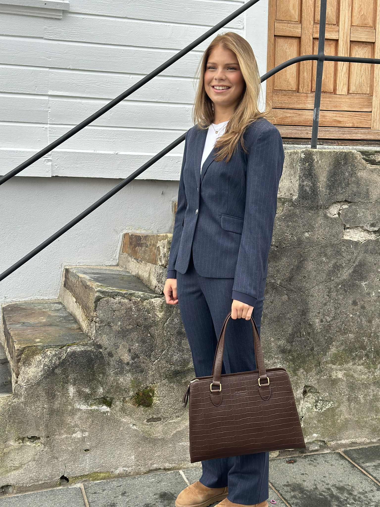 Modellen på bilde har på seg 36 i jakke, og 34 i bukse. Vesken er fra O My Bag.