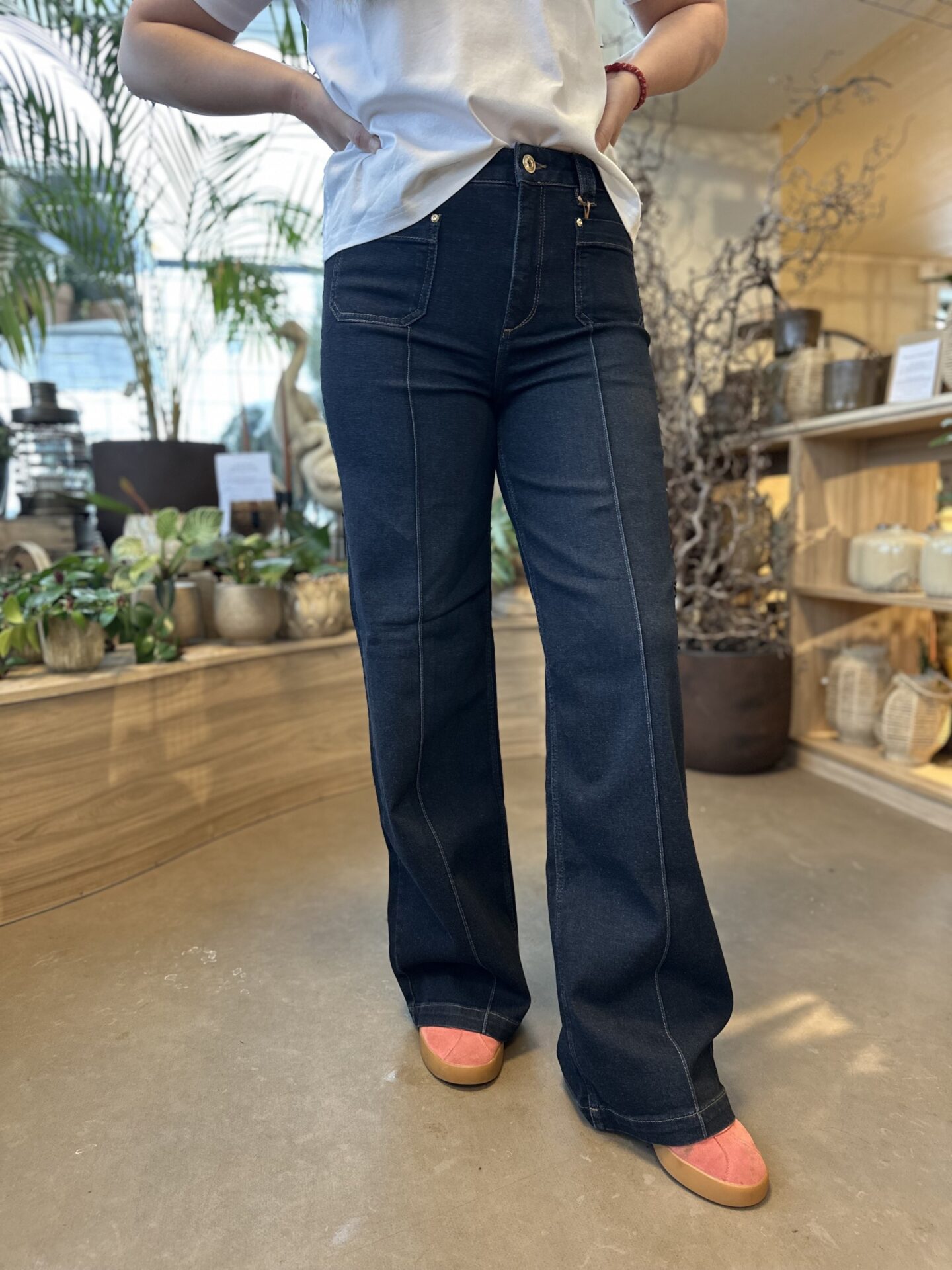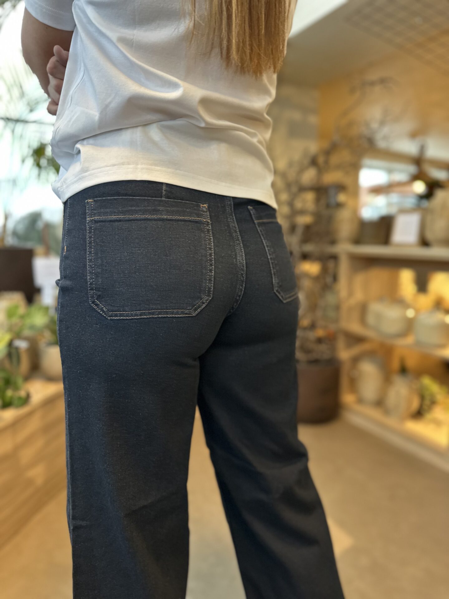 Bukserne har en flott mørk denimvask og elegante vide bein.,