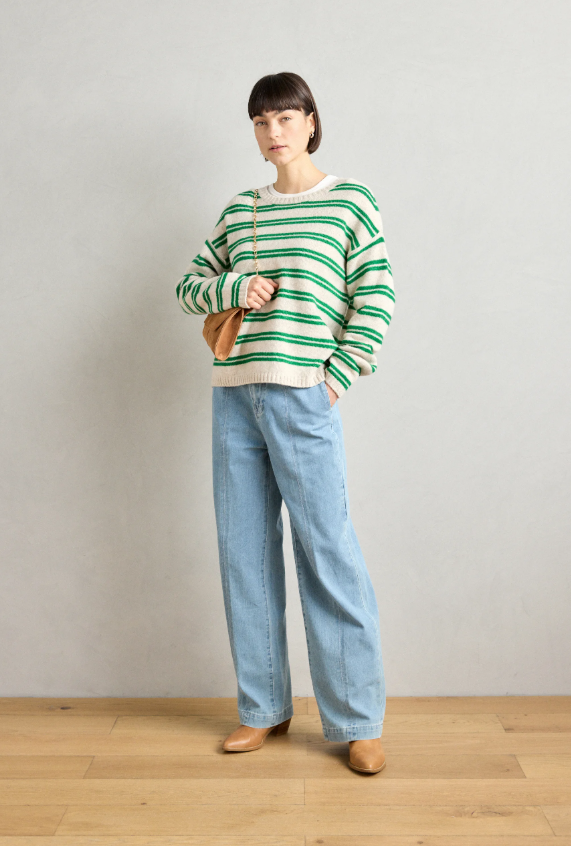 Avslappet silhuett med rund hals og ribbestrikkede kanter