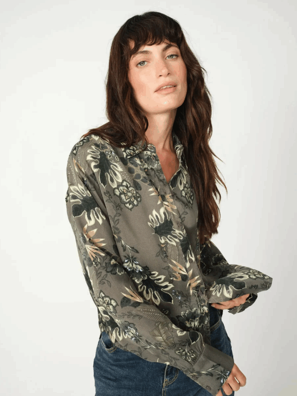 Denne modellen, designet i en elegant, smal silhuett, er laget av ultramykt og elastisk materiale. Den har en klassisk krage, elegante mansjetter med volanger og en tidløs knappelukking foran. Kombiner den med mer strukturerte plagg, slik at de sjarmerende mansjettene diskret titter frem under ermene.