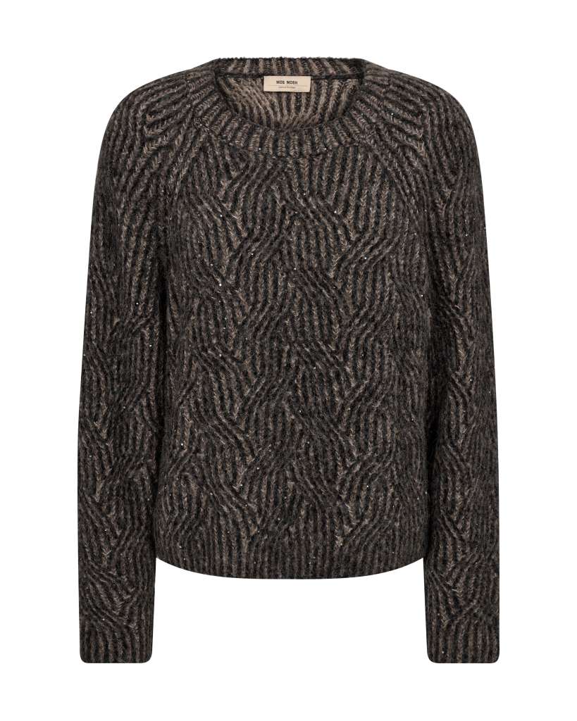 Denne strikken er der komfort møter subtil glamour. Laget i et mykt, grovt garn med et dristig, teksturert mønster, og med delikate paljetter vevd inn — som fanger lyset ved hver bevegelse. Den avslappede silhuetten og den klassiske rundhalsen gjør den enkel å bruke, mens den dype, mørke fargen gir dybde og eleganse. Perfekt for å løfte hverdagslooken din eller for lag-på-lag-stil på kjølige dager med et snev av glans.