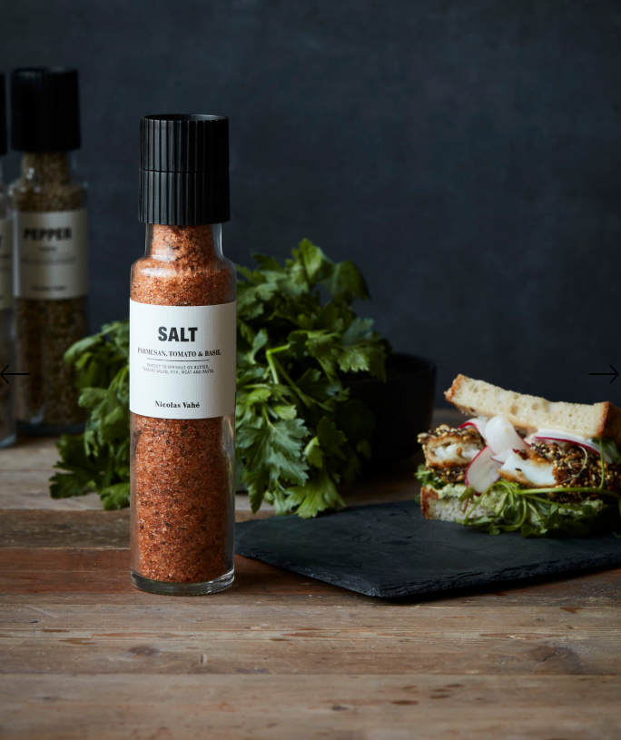 Denne saltsammensetningen fra Nicolas Vahé er en nydelig kombinasjon av salt, tomat, parmesan og basilikum. Når den ikke er i bruk, kan kvernen pynte opp kjøkkenbenken eller spisebordet ditt. Saltet er spesielt godt egnet til å drysse over smør, tomatsalat, fisk, kjøtt og pasta. Kvernen har en keramisk mølle som gir deg finmalt krydder. Dette frigjør oljene for mer aroma og smak i rettene dine.