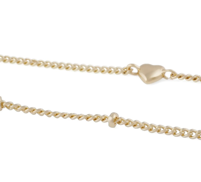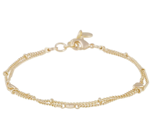 Vakkert 2-radet armbånd i forgylt messing dekorert med to søte hjerter. Bruk armbåndet alene eller sammen med andre armbånd for en mer trendy stil. Flott gave til en du er glad i! Armbåndet har en lengde på 16-18,5 cm og er allergivennlig.