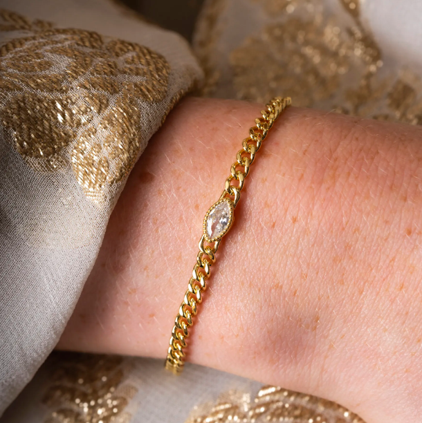 Klassisk armbånd i 925 forgylt sølv med en hvit zirkonia sentersten som prikken over i’en. Armbåndet har en forlenger på 3 cm som gjør at det passer de fleste. Finnes i flere farger.