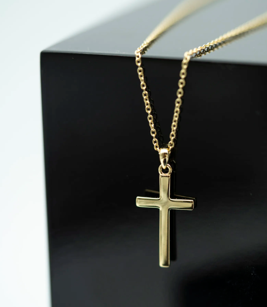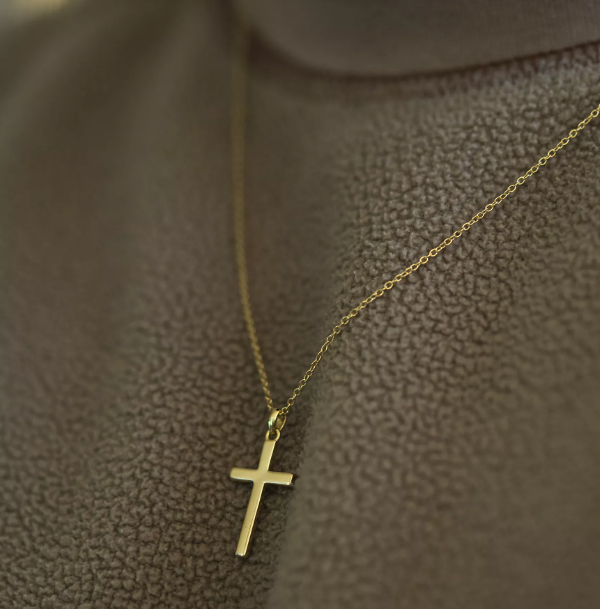 Klassisk og tidløst kors i 925 forgylt sølv, designet for å gi et elegant uttrykk. Anhenget måler 28 mm i høyden og 13 mm i bredden, og henges fra et solid ankerkjede på 50 cm, som gir en perfekt lengde for daglig bruk eller spesielle anledninger.