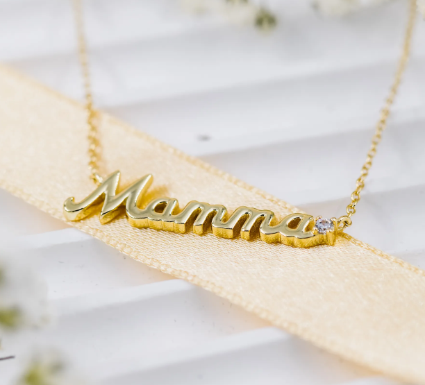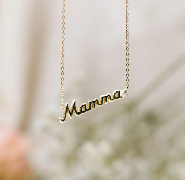 Dette vakre smykket i forgylt 925 sølv har teksten «Mamma» og en glitrende zirkonia, som symboliserer kjærlighet og takknemlighet. En meningsfull gave som passer perfekt til morsdag, bursdag, eller som en spontan gest for å vise hvor mye hun betyr.