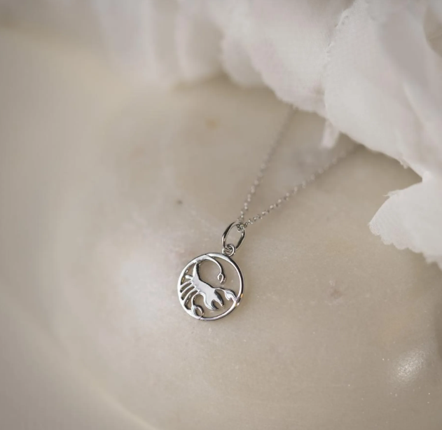 Stjernetegn smykke med skorpionen i 925 sølv. Skorpionen assosieres med intensitet, mystikk og transformasjon. Perfekt som gave til deg selv eller noen du er glad i.