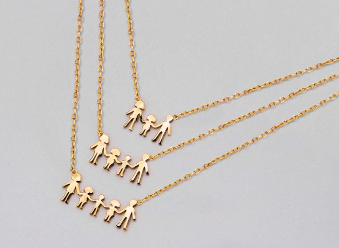 Dette unike familiesmykket i forgylt 925 sølv er designet med et anheng som symboliserer mamma, pappa og to jenter og en gutt. Det er perfekt som gave til en mamma ved babyshower, som fødegave, morsdag, bursdag eller som en hjertevarmende julegave.