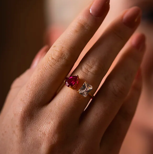Trendy, åpen ring fra Pan Jewelry sin GLAM serie i forgylt 925 sølv. Ringen har store flotte dråpeformet og rektangulær zirkonia stener. Prikken over i’en til ethvert antrekk!