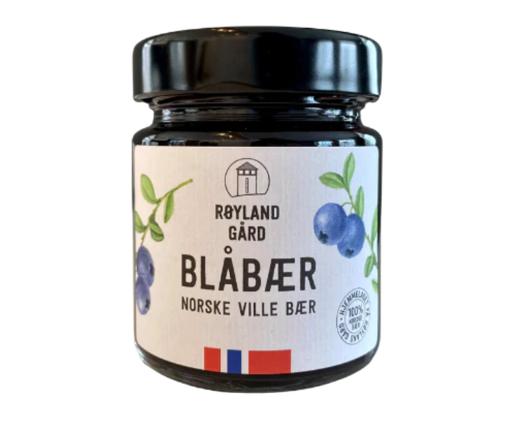 Røylands Blåbærsyltetøy av norske ville bær, rett fra tua. Syltetøyet smaker mye blåbær og er friskt og passe søtt. Røyland blåbærsyltetøy er det perfekte følge pannekaka, vaffelen eller grøten. Også nydelig på brødskiva. Røylands blåbærsyltetøy er et nydelig friskt syltetøy til hverdag og fest. Syltetøyet er det perfekte følge til brødskiven, vaffelen, kaken eller grøten. Nydelig smak av norske ville bær rett fra tua