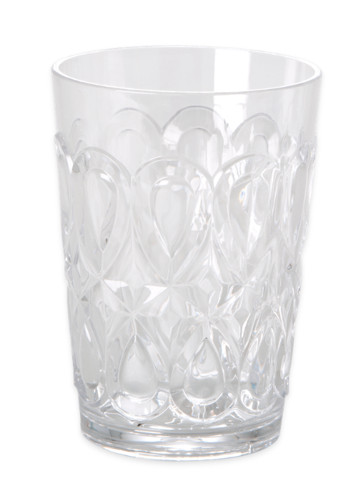 Et stort og dekorativt vannglass i klar akryl med vakre fasettslipte detaljer