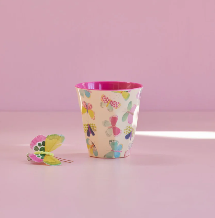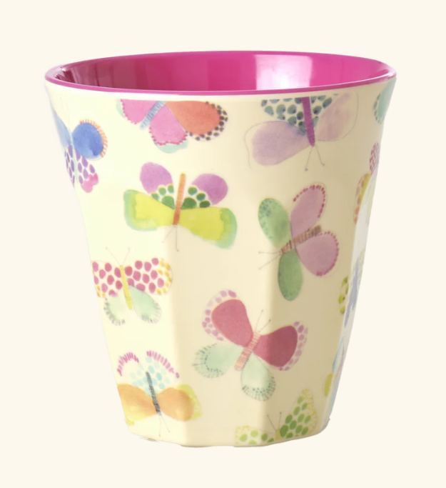 Vår populære medium RICE-melaminkopp med Butterfly-mønster. Vakre, håndmalte sommerfugler svever lett og lekent på en elegant kremfarget bakgrunn. Innvendig er koppen neonrosa. Denne koppen er en av våre favoritter… Bruk den til akkurat det du ønsker – som drikkekopp, til penner eller småting, ta den med på piknik, eller fyll den med vakre blomster og urter. Vær kreativ – mulighetene er uendelige og himmelen er grensen!