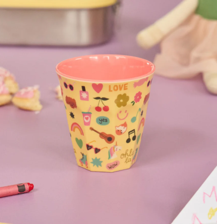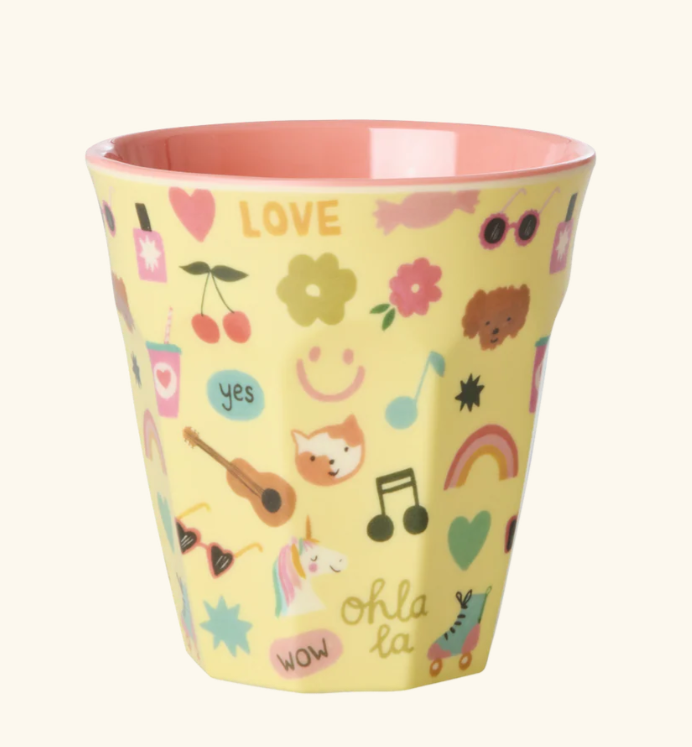 Nyt hver slurk med vår gule medium kopp! Den er pyntet med blomster, solbriller og regnbuer, og er laget av det praktiske materialet melamin – perfekt for små nysgjerrige hender! Melamin er slitesterkt og ideelt til hverdagsbruk på grunn av sin styrke og enkle rengjøring. Merk at produktet ikke egner seg for mikrobølgeovn.