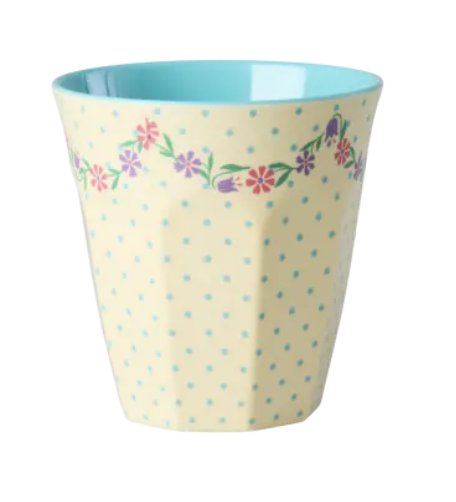 Denne medium melaminkoppen fra Rice har et lekkert cream-farget design med prikker og blomster. Et lekent og tidløst uttrykk som passer både store og små. Perfekt til hverdagsbruk og hyggelige stunder.