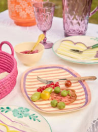 Laget av slitesterk melamin, er den både lett og robust – ideell for både barn og voksne, inne som ute. De livlige prikkene og de delikate blomstene gir et sjarmerende og fargerikt preg som vil lyse opp ethvert måltid.