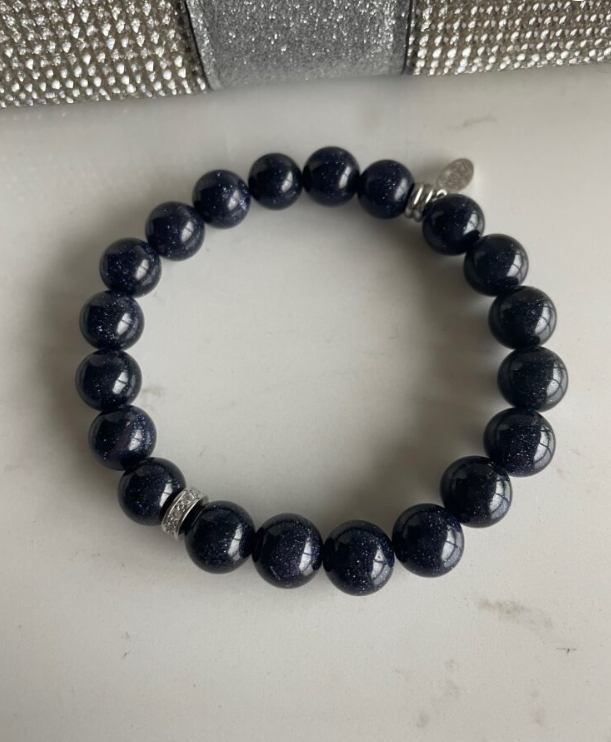 Armbånd i nydelig glitrende Blå Sandstein med søt liten sølvfarget strass rondell og navnetag i rustfritt stål. 10mm