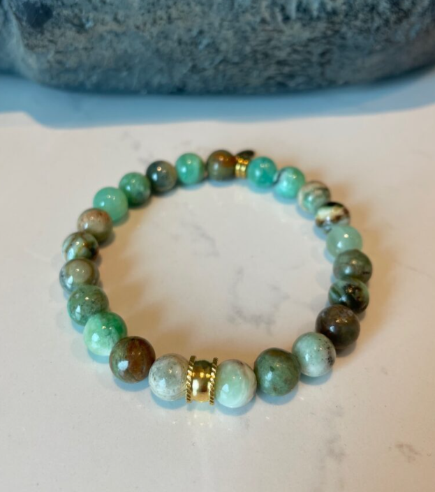 Armbånd i grønn Agat steinperler med gyllen rustfritt stål rondell. Denne steinen har en fantastisk fin sjattering i grønt og brunt. 8mm