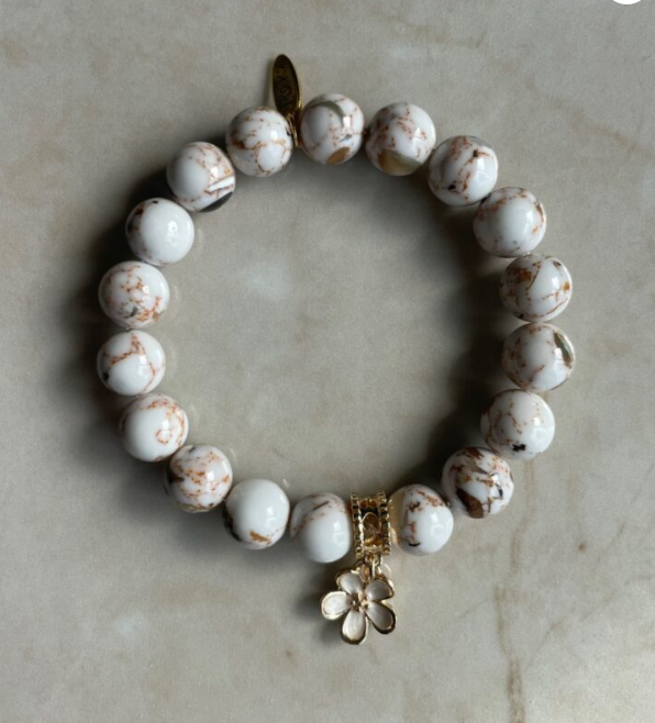 Armbånd i kokos steinkompositt med biter av shell, og anheng i gyllen og hvit blomst/kule.10mm