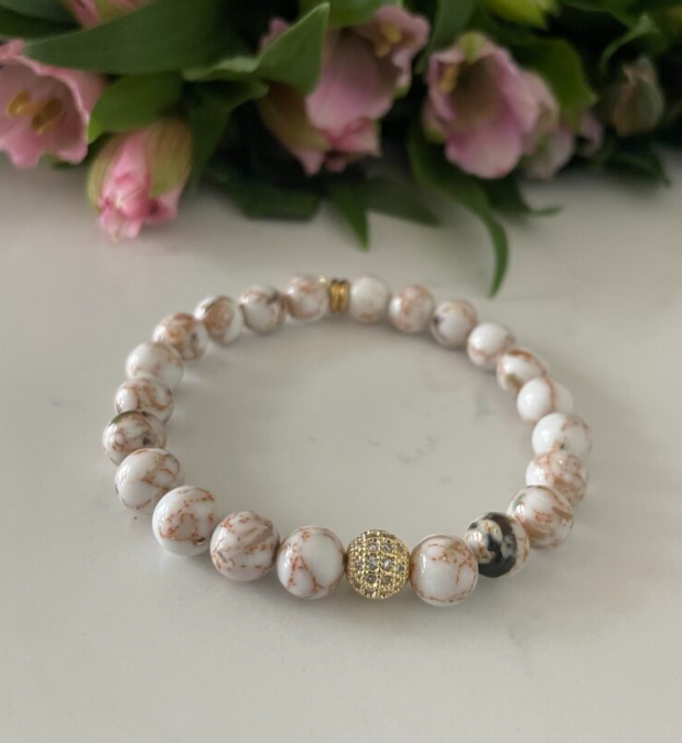 Armbånd Kokos i perler av steinkompositt med biter av shell og gyllen rhinestone pynt.