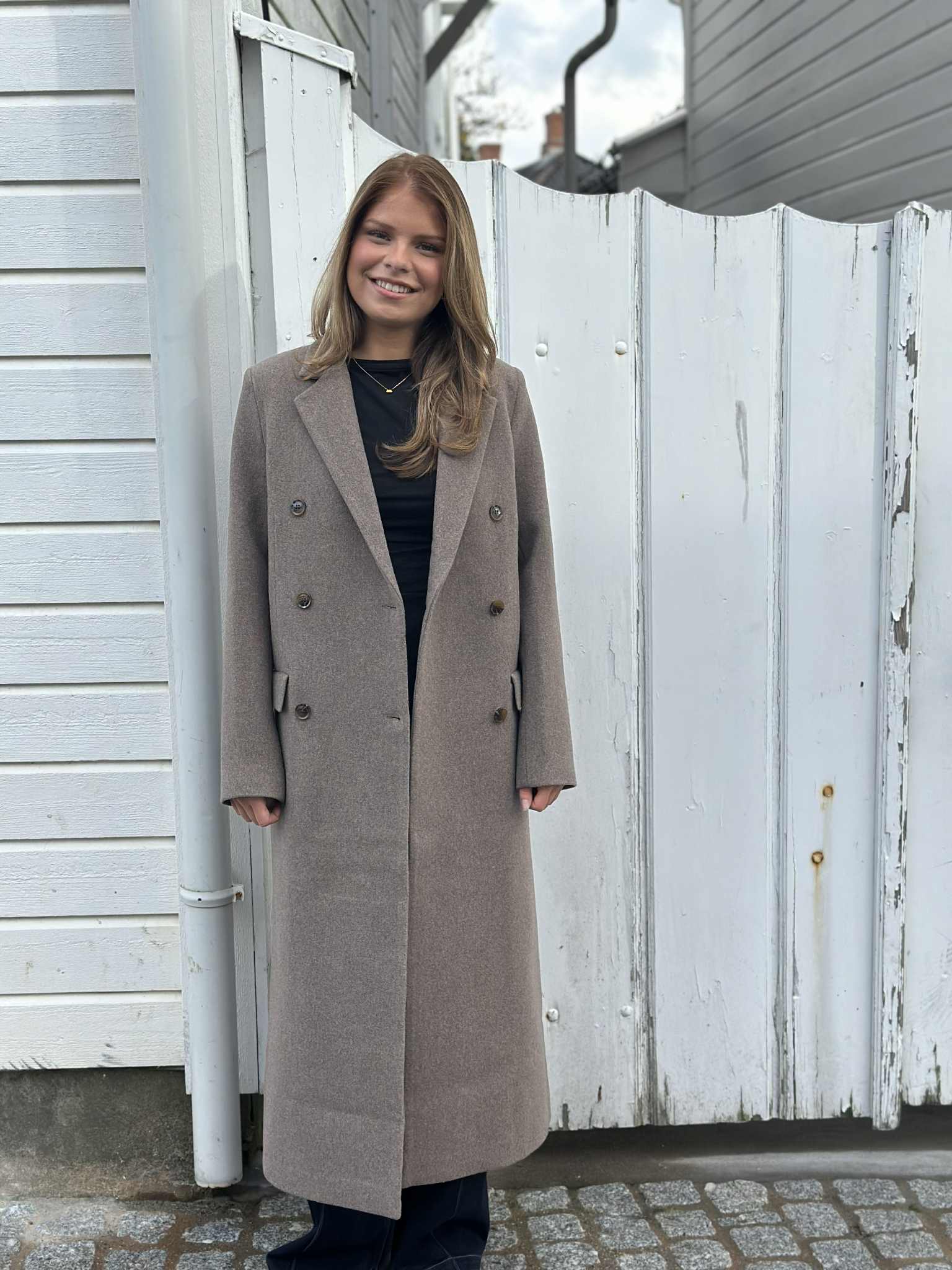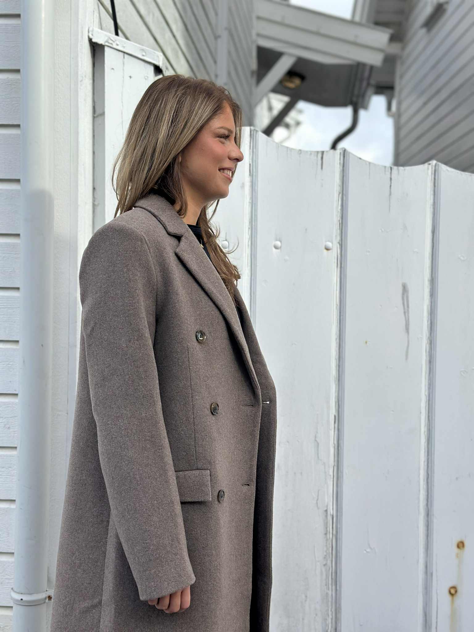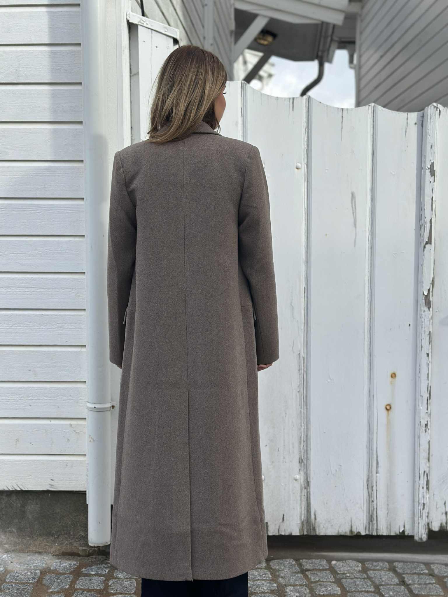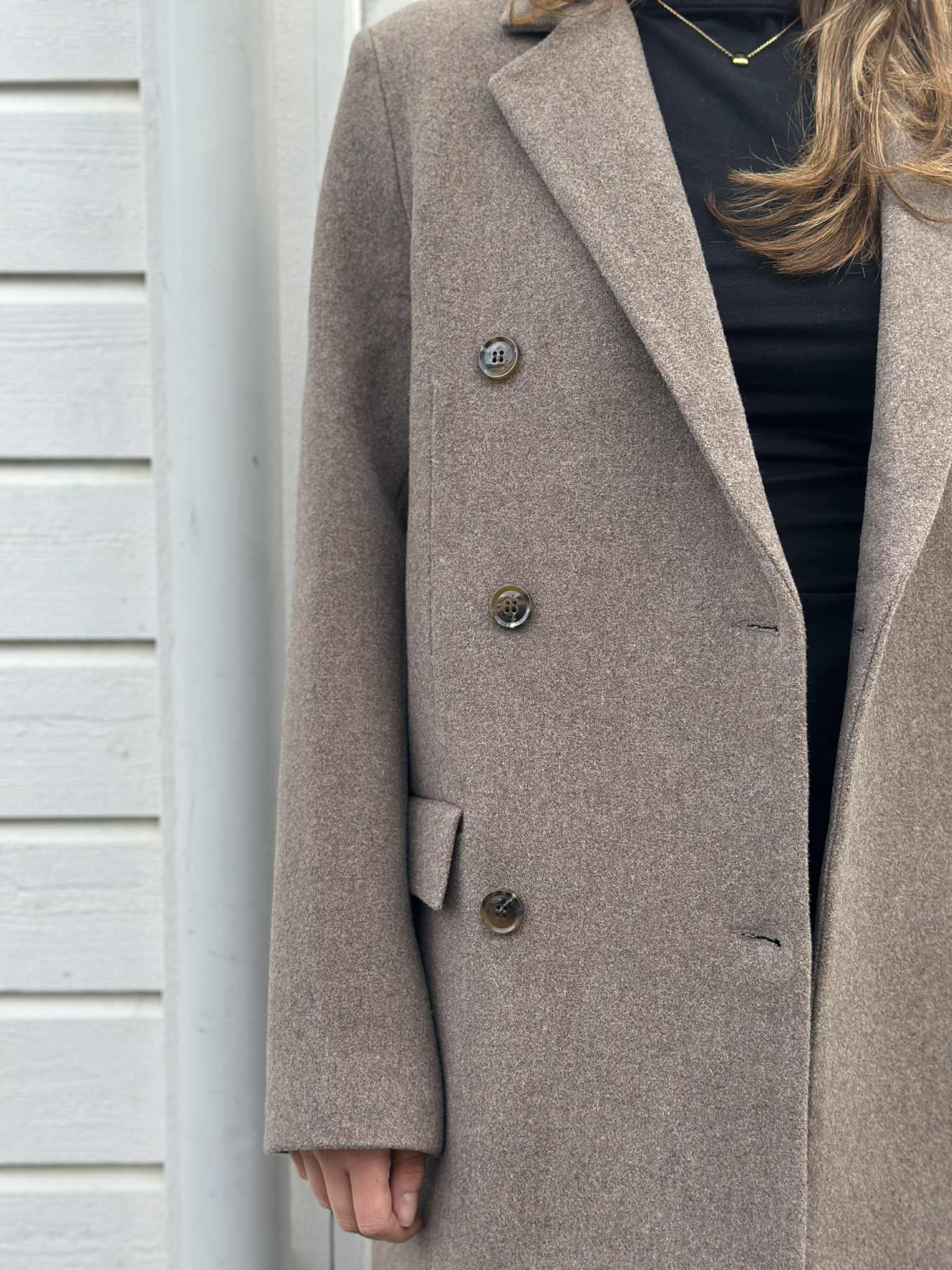 Lang kåpe med rett passform. Dobbelspent knappelukking i front og klafflommer foran. Kåpen har klassisk jakkeslag, lang splitt bak og er helfôret. Hovedmaterialet er vevd i Italia av en blanding med resirkulert ull og resirkulert polyester – et stilfullt valg med et bærekraftig preg.