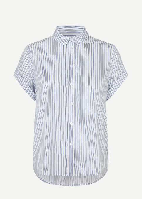 Majan SS Shirt fra Samsøe & Samsøe er en kortermet stripete skjorte laget i et behagelig viskosemateriale. Skjorten har krage, korte ermer med oppbrettet kant og knappelukking i front. Denne skjorten passer perfekt til varme sommerdager.