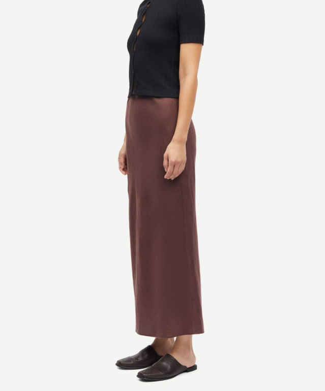 Dette maxiskjørtet har en midi-midje og en slank passform som fremhever silhuetten på en flatterende måte. Skjørtet er utstyrt med en usynlig glidelås og hake for en sømløs og sikker lukking. Den elastiske linningen sikrer en komfortabel passform gjennom dagen, mens hovedmaterialet i 100% lin tilbyr en lett og pustende kvalitet. Perfekt for både uformelle og mer formelle anledninger.