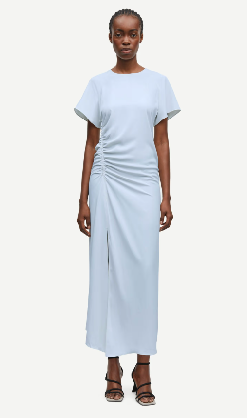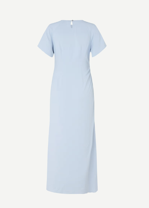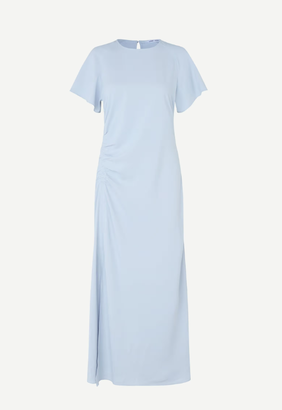 Kortermet maxikjole med vanlig passform. Knapp- og hempelukking bak og usynlig glidelås på siden. Fast rynking i siden. Splitt i benet. Hovedmateriale laget av 100 % resirkulert polyester. Dette produktet er GRS-sertifisert. Hvert ledd i forsyningskjeden har oppfylt strenge sosiale, miljømessige og kjemiske krav. En virkelig nydelig kjole!
