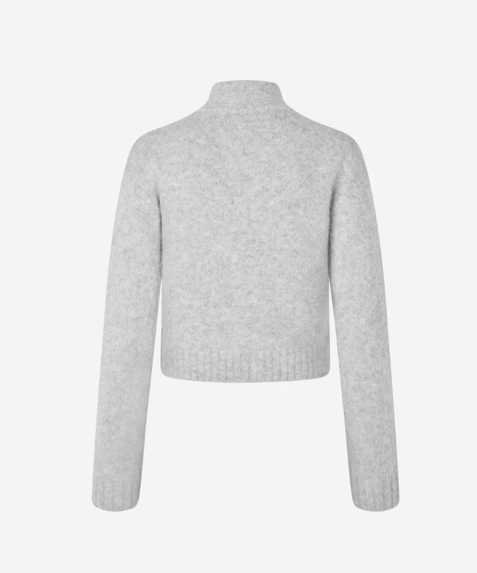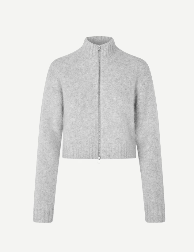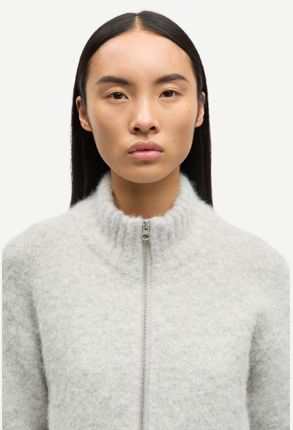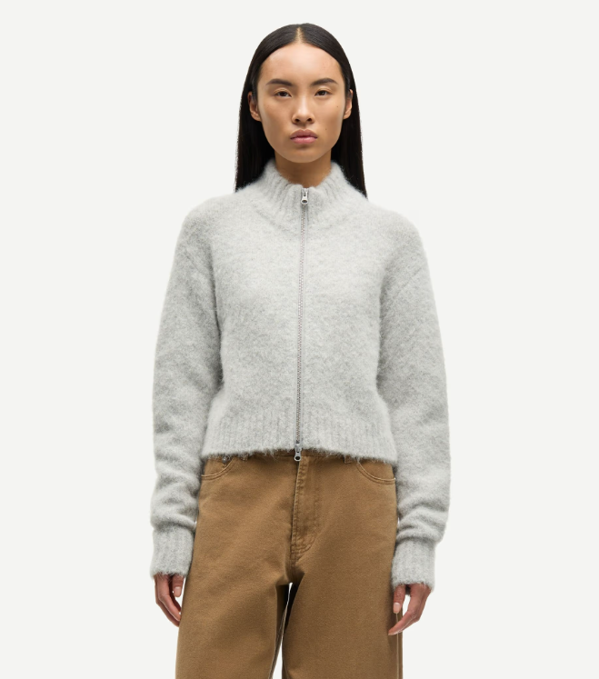 Strikket cardigan med vanlig passform. Toveis glidelåslukking foran. Ribbestrikket krage, mansjetter og kant nederst. Høy hals. Børstet overflate. Hovedmaterialet er laget av en elastisk blanding som inkluderer alpakkaull.