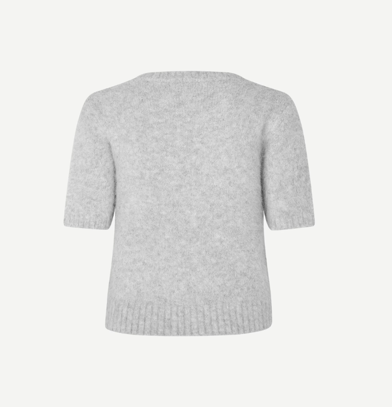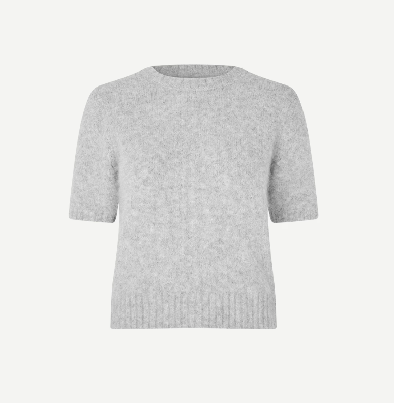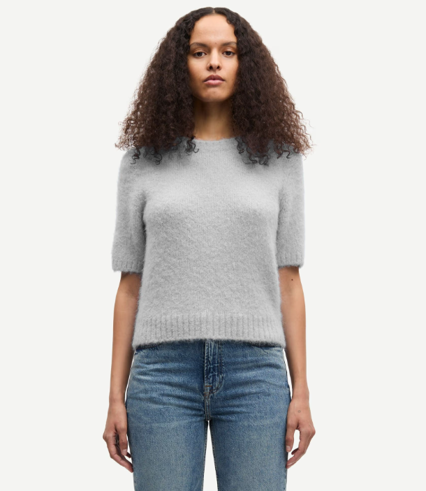 Kortermet genser med vanlig passform og cropped silhuett. Ribbestrikket krage, mansjetter og kant nederst. Rund hals. Børstet overflate. Hovedmaterialet er laget av en elastisk blanding som inkluderer alpakkaull.