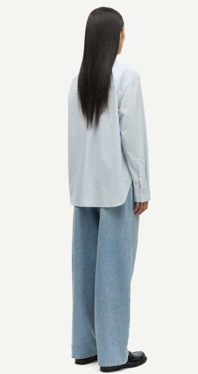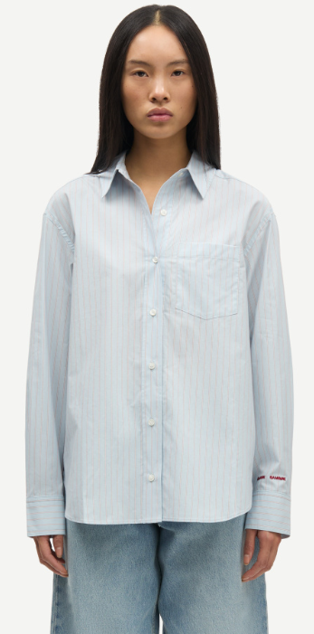 Salova Pocket Shirt fra Samsøe & Samsøe. Denne skjorten er et tidløst tilskudd til garderoben din, ideell for både arbeid og fritid. Skjorten kommer i en delikat lyseblå farge med striper, samt liten Samsøe logo ved mansjetten. Salova Pocket Shirt har klassisk krage, lange ermer med mansjetter og lukkes med knapper foran. Den har en rett og avslappet passform, og er laget av myk bomullskvalitet som føles svært behagelig på.