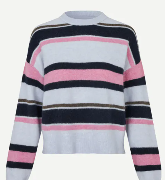 Sanoura Sweater er en nydelig strikk fra Samsøe & Samsøe. Den er strikket i myk ullblanding som føles myk og behagelig på. Genseren kommer i en lyseblå farge med trendy striper i sort og rosa. Med rund hals, lange ermer og en avslappet passform blir dette et perfekt plagg for både hverdagsbruk og avslappede dager.