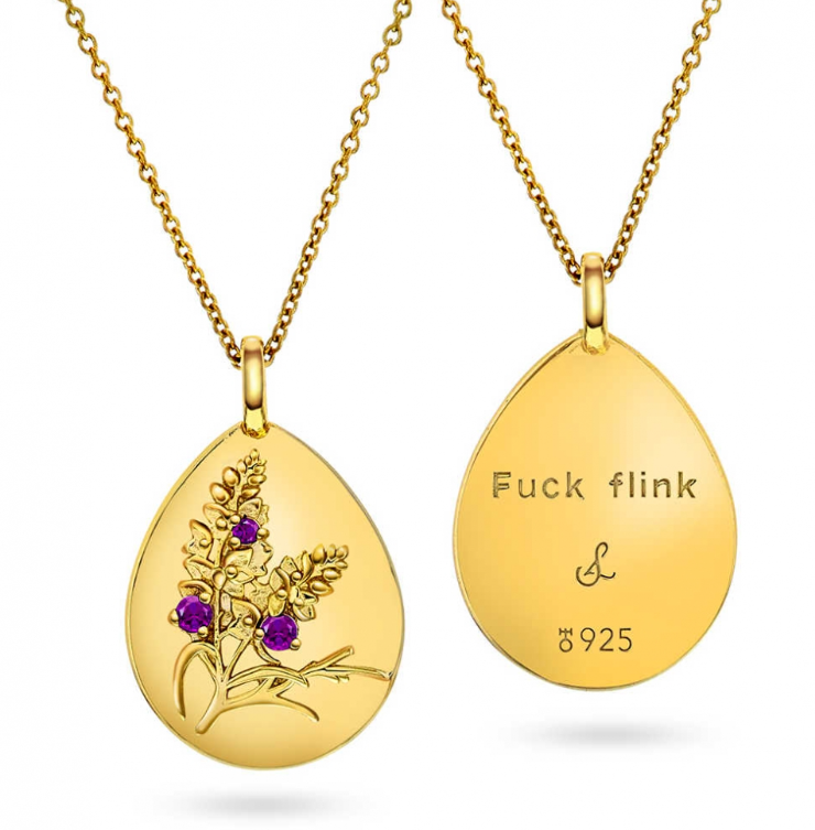 Medaljong «Fuck Flink» i forgylt sølv med ametyst. L: 45+5cm, H: 21mm, B: 14mm.