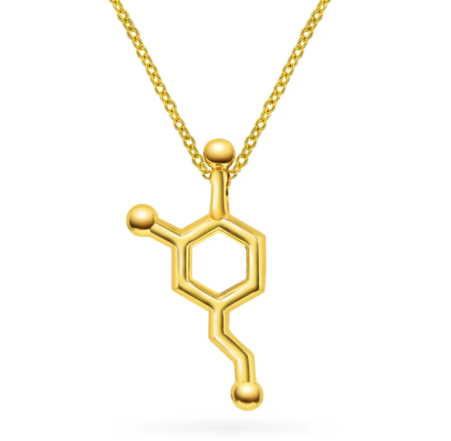 Motivasjon og glede reguleres av molekylet dopamin og med dette smykke i forgylt sølv skal det påminne deg om å følge det som gir deg energi og mening, og om å finne glede i store og små øyeblikk. Gjør settet komplett med tilhørende armbånd og ring.