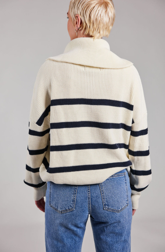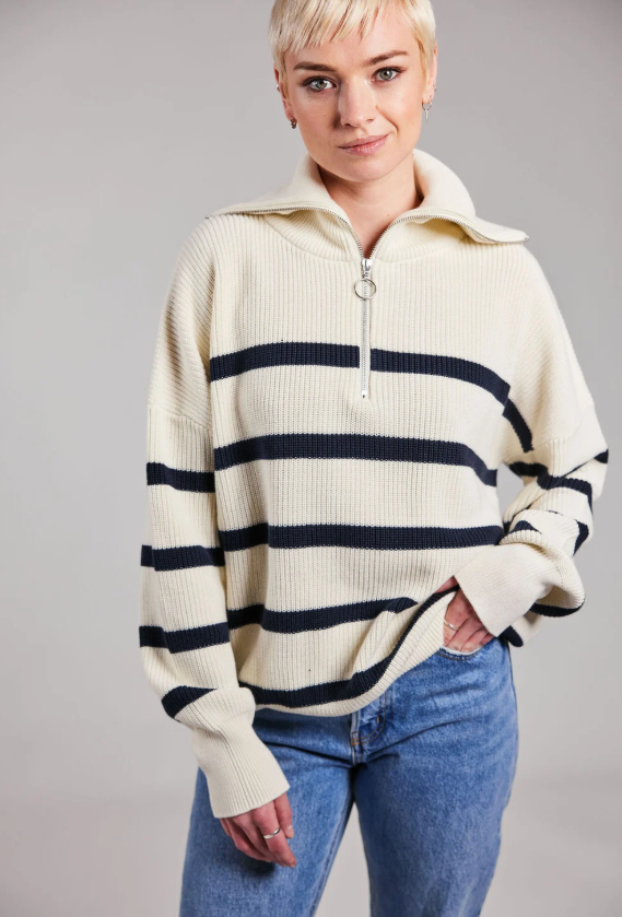 Denne strikkede genseren med halv glidelås kombinerer stil og komfort på beste vis. Den oversized passformen gir en avslappet look og ekstra varme, ideell for kalde dager hjemme eller ute.